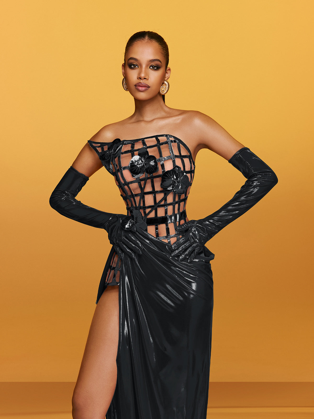 Aethon Strapless Metallic Flower Maxi Dress In Black