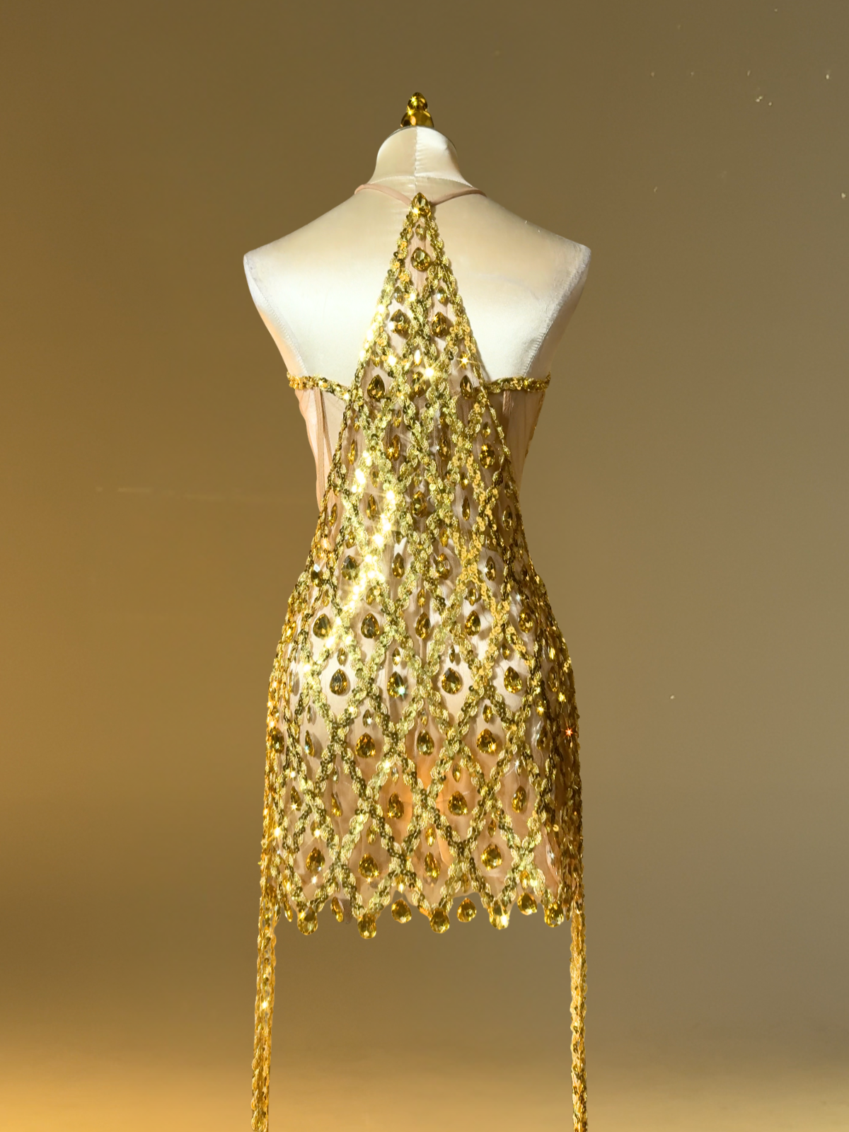 Indulge in pure glamour with our Diego Rhinestone Fringe Sequin Mini Dress! The gold hue and sparkling...