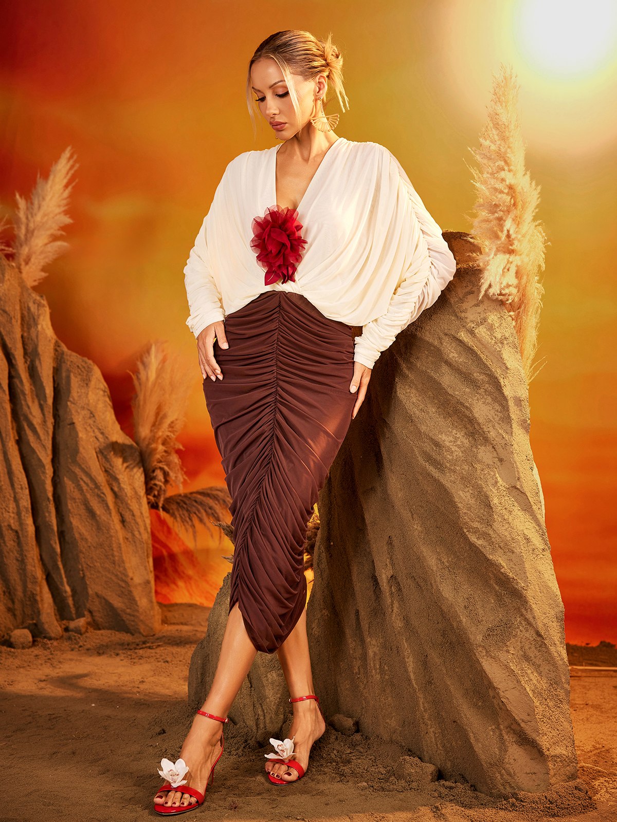 Eldrik V Neck Flower Ruched Midi Dress