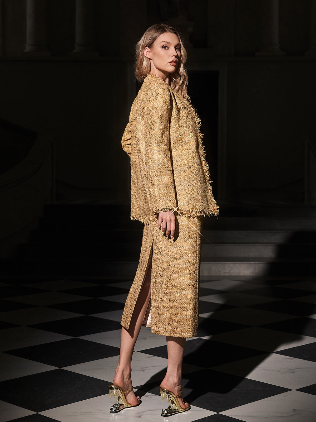 Make a bold statement with the Fyren Strapless Sequin Tweed Blazer Set. This chic ensemble combines elegant...