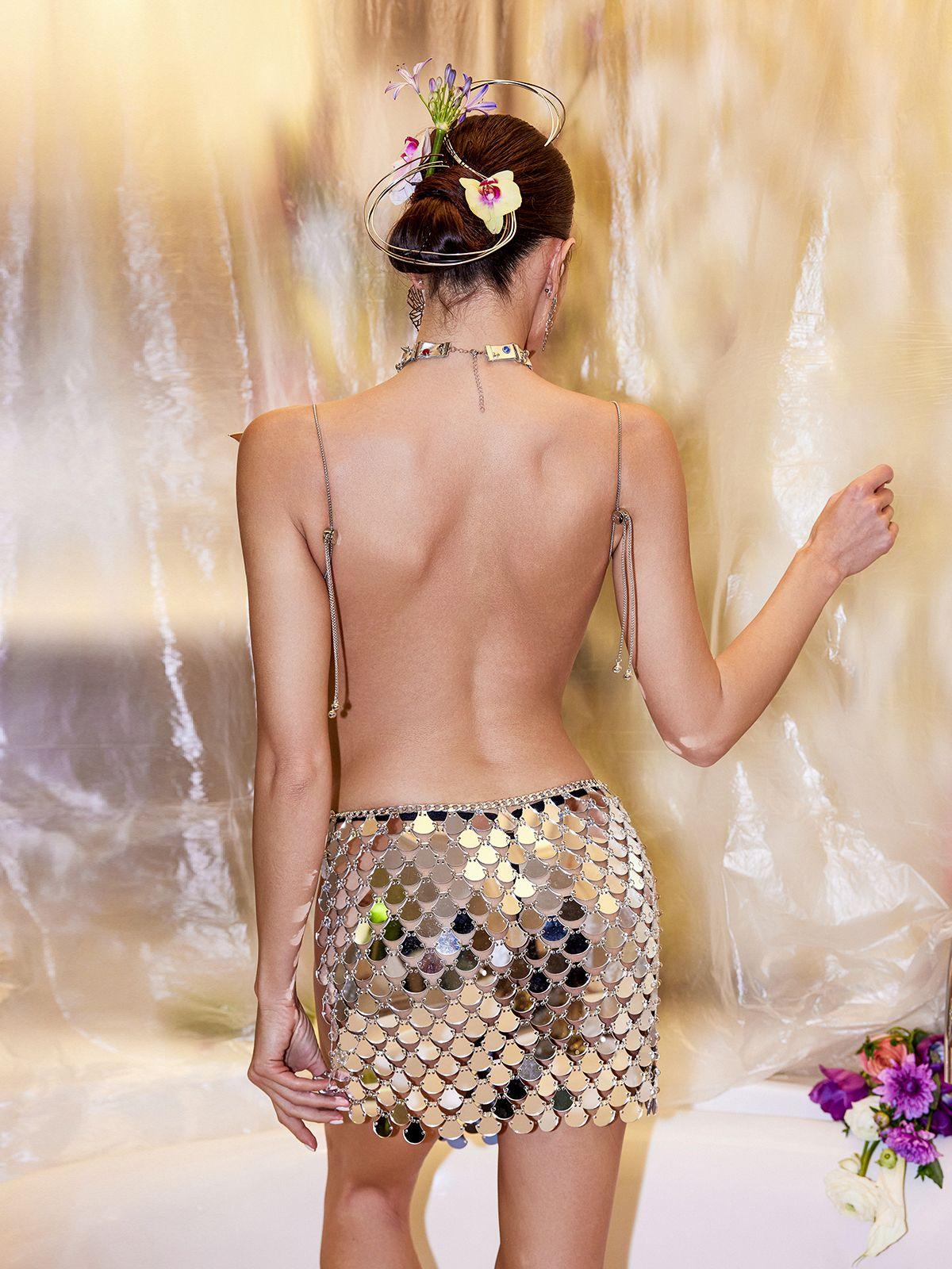 Introducing the Ilya Butterfly Glossy Armor Top In Silver. With its unique butterfly shape and glossy armor...