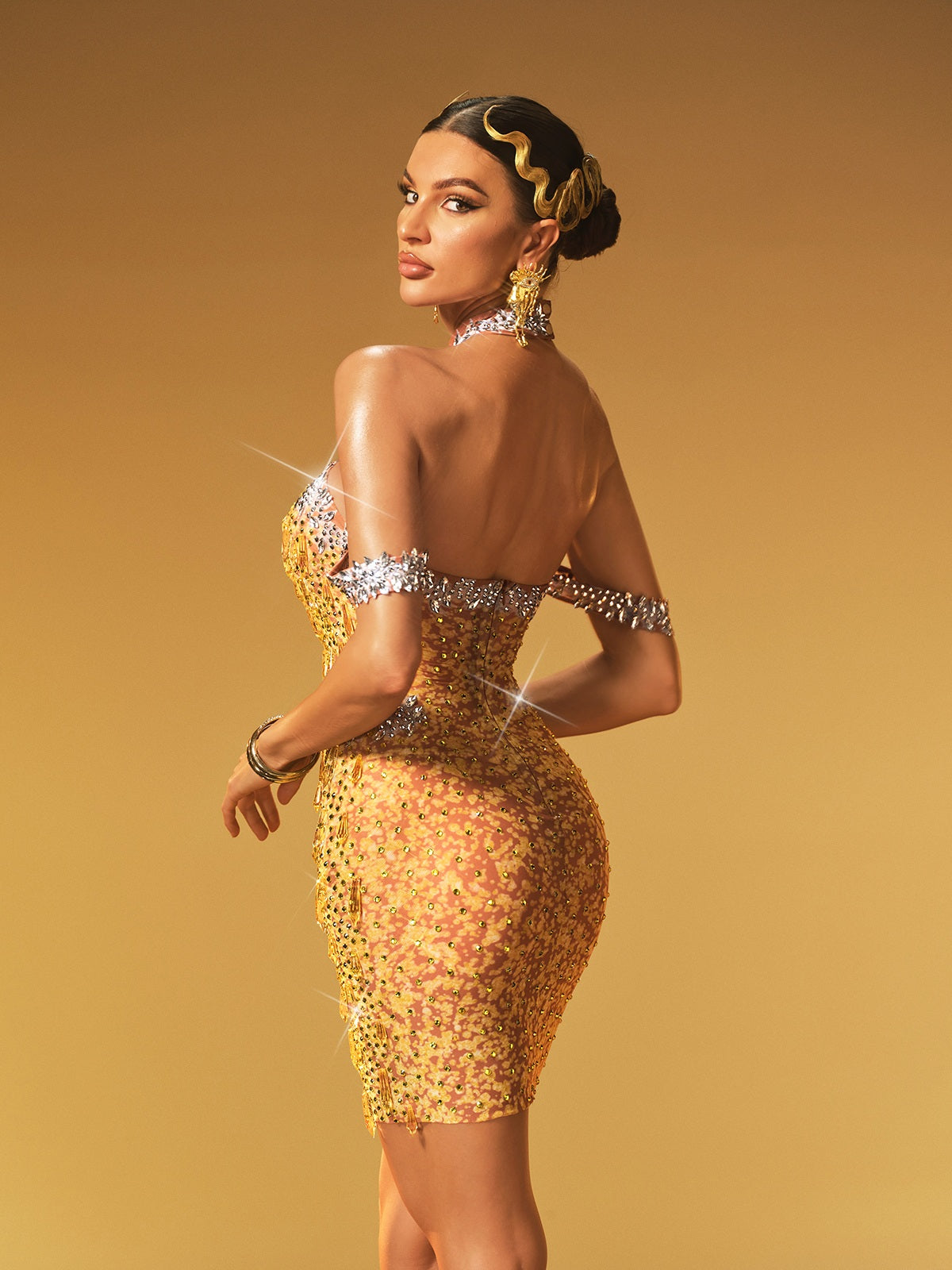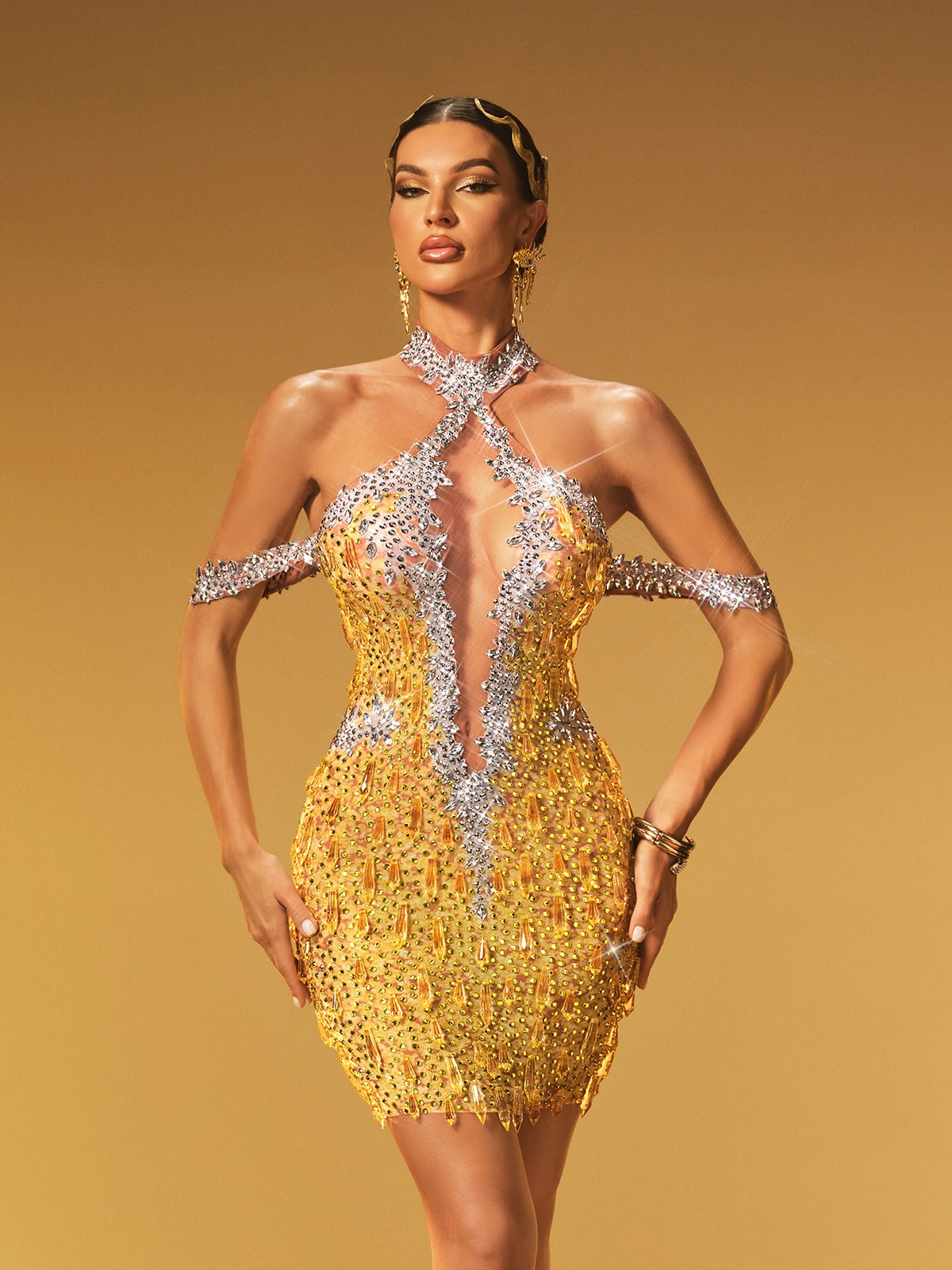 Elevate your evening with the Krythos Halterneck Crystal Mesh Mini Dress in Chartreuse. This stunning dress features...