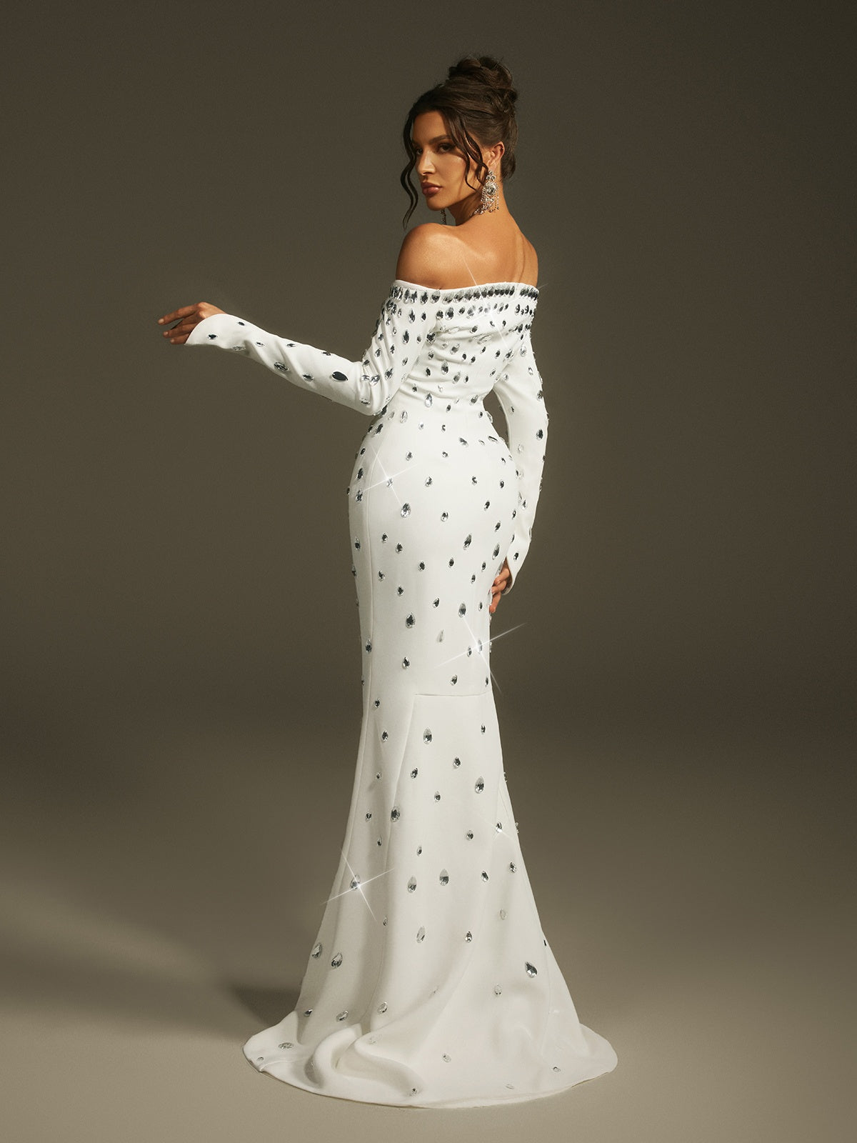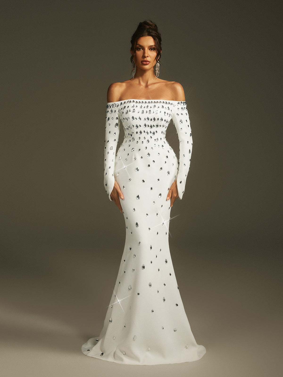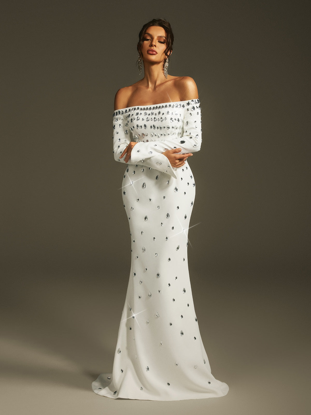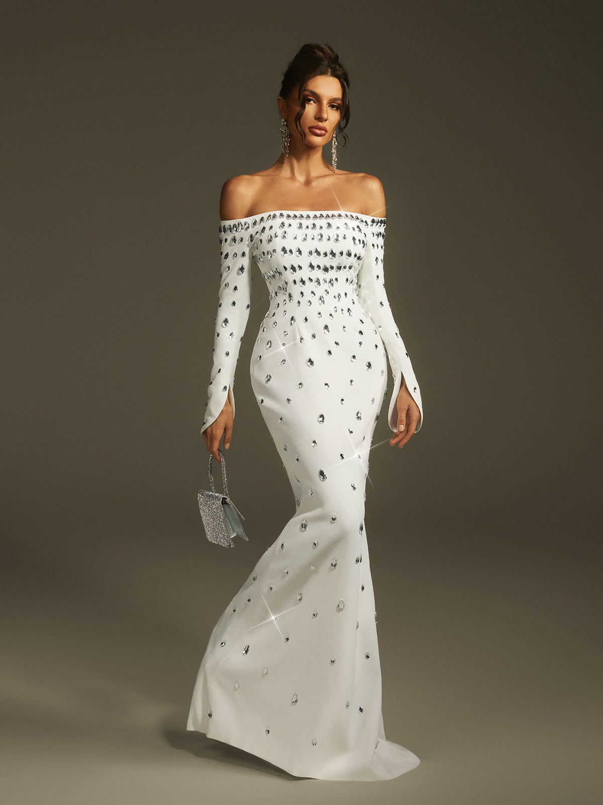 Turn heads with the Leehi Off Shoulder Crystal Maxi Dress. a dazzling choice for any special occasion....