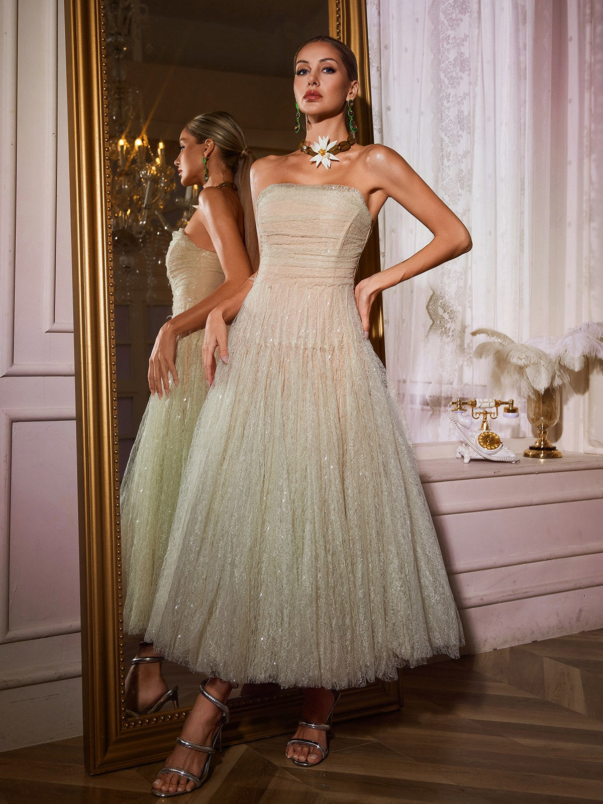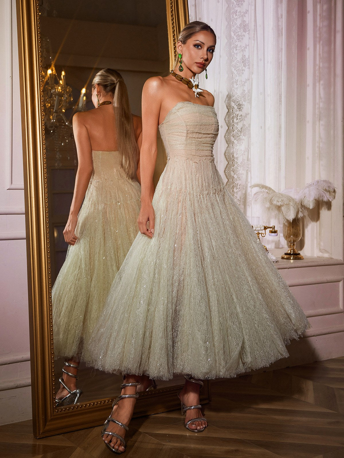Make a bold statement with the Nakia Strapless Ruched Mesh Midi Dress in Green. This elegant dress...