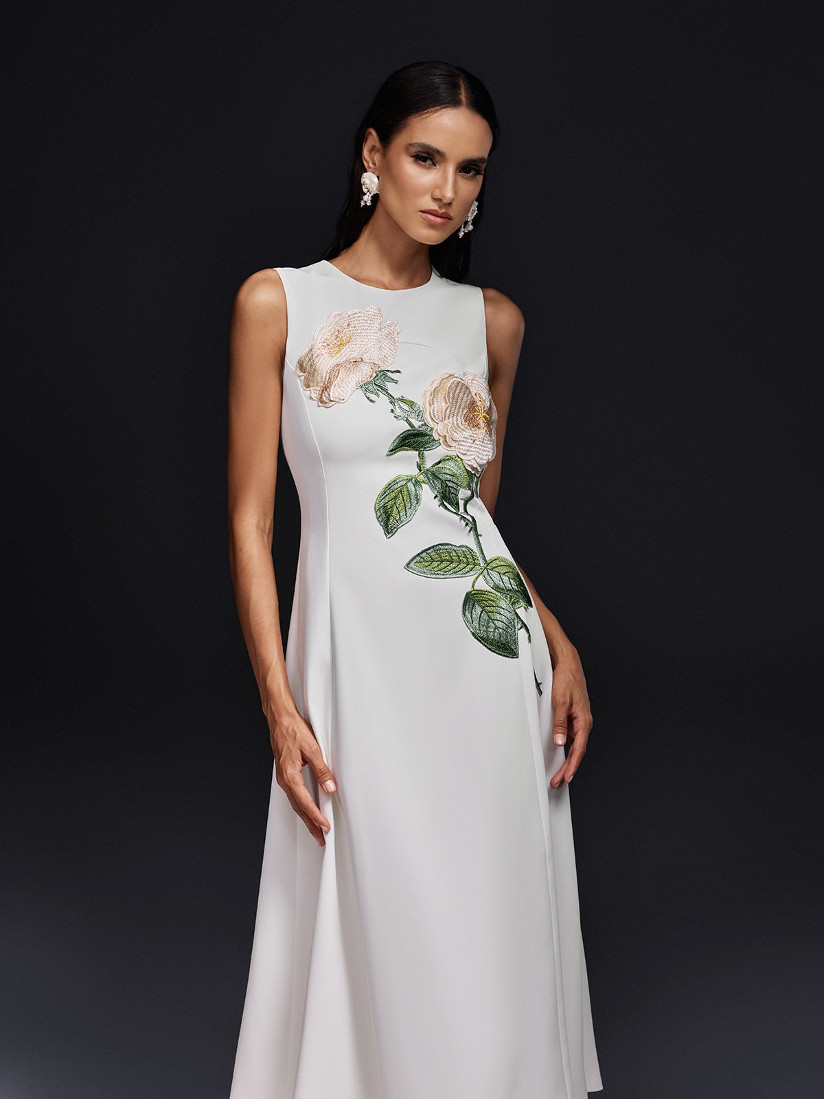 Ogima Sleeveless Flower Embroidered Midi Dress In White