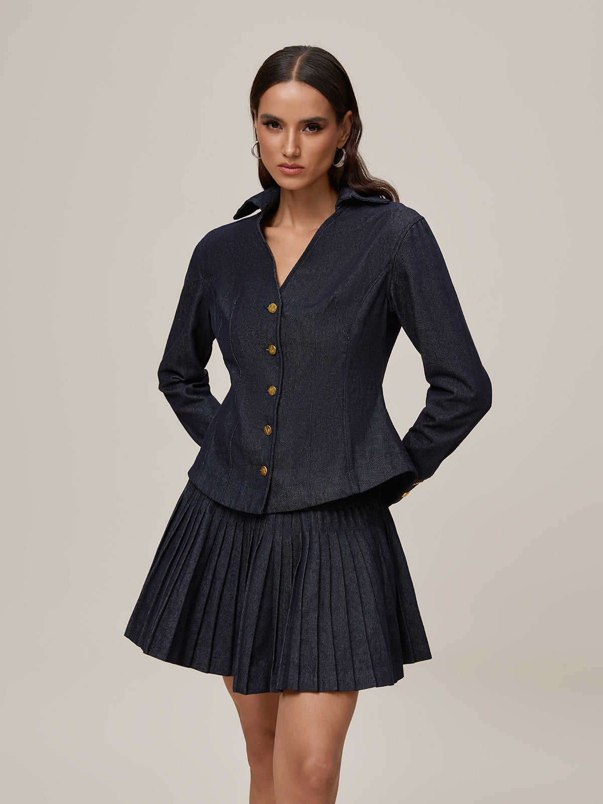 Elevate your casual wardrobe with the Onaedo V Neck Pleated Denim Skirt Set. This stylish ensemble combines...