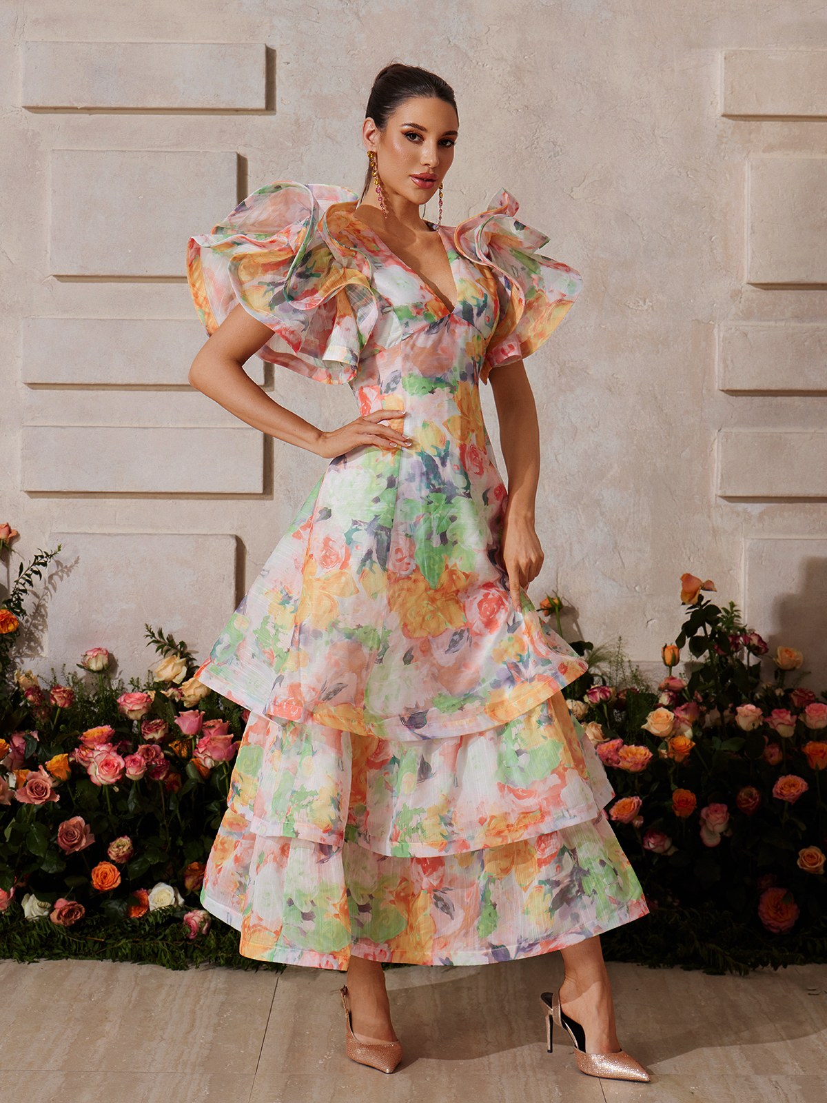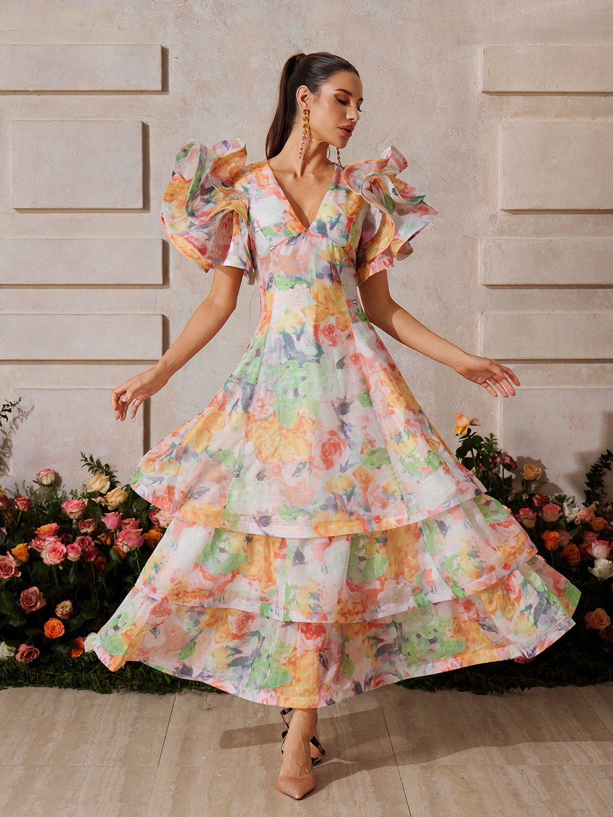 Rivyn V Neck Floral Printed Maxi Dress In Orange