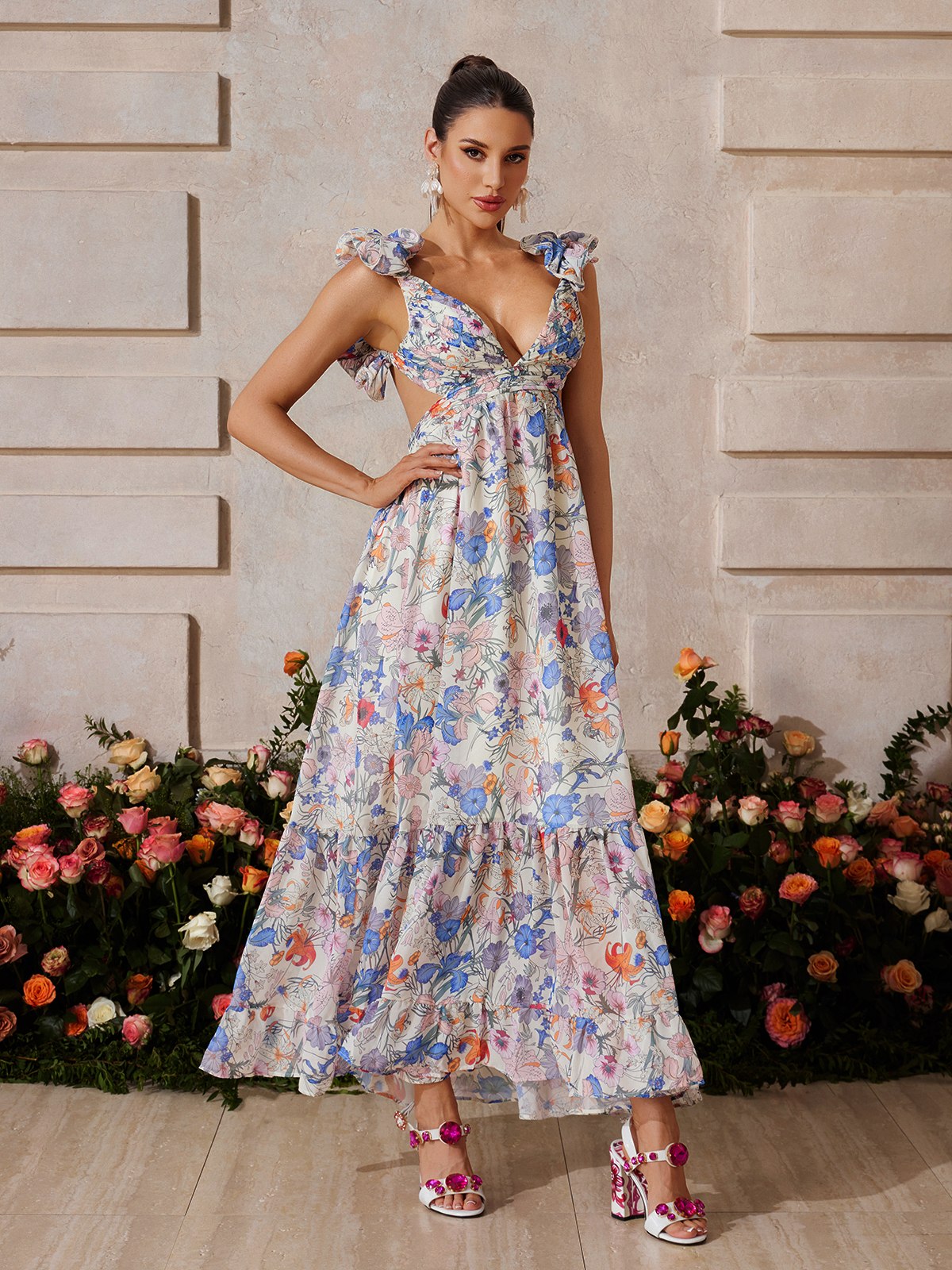 Step into effortless elegance with the Yryssa Backless Floral Ruffle Maxi Dress. Its flowing silhouette and delicate...